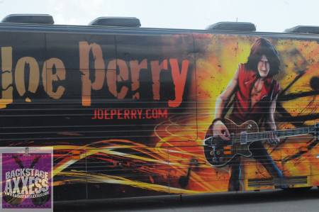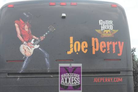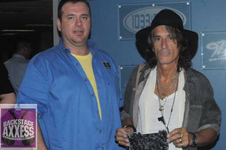 Since the Aerosmith tour is cancelled, guitarist Joe Perry is traveling around on his bus to local radio stations to talk about the unfortunate situation with the 2009 tour and the new Joe Perry Project CD. We went down to the 97 Rock and 103.3 The Edge Radio Station Building on Thursday August 13, 2009 to hook up with Joe on something that Backstageaxxess.com will be taking part in later this year. Me and an associate (and contributor to our site) Ross Catalino from Back to Back Entertainment were able to get Joe to sign a pick guard for a “Tunes for Tots” auction that will be held at the McKinley Park Inn that will be held in Blasdell, NY on December 6, 2009. He was more than happy to do this and we were lucky to grab the legend for a couple of quick photos as well!
